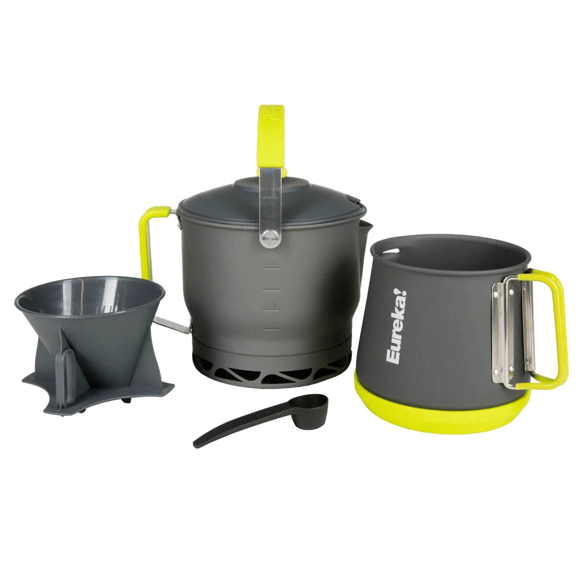 Nesting together for easy transport and storage, the Camp Cafe brews quality coffee for the whole crew quickly and cleans up in a snap. Equipped with Eureka!’s patented Flux Ring technology, the 2. 5-liter (80-ounce) boiling kettle boils water twice as fast as a standard kettle. Make quality coffee for the whole crew with the pour-over filter holder and 12-cup (60-ounce) coffee carafe.